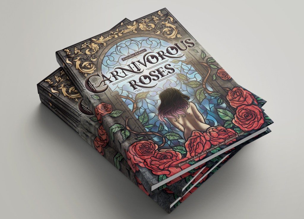 L’autrice m’a demandé d’illustrer la couverture de son premier livre, un recueil de poèmes, intitulé « Carnivorous roses ». Sa demande de base était de faire apparaitre une femme de dos, et que la couverture résonne avec le titre et les thèmes abordés (amour, douleur, contemplation…) j’ai donc opté pour du digital painting rappelant le vitrail, tout comme l’iconographie, non sans rappeler le titre et l’aspect contemplatif des récits. Le travail typographique est venu complété l’ensemble pour créer une composition charnue et harmonieuse.